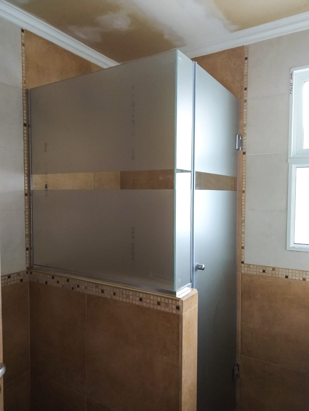 Divisor de baño en vidrio opaco con accesorios de aluminio. Moderno y funcional.