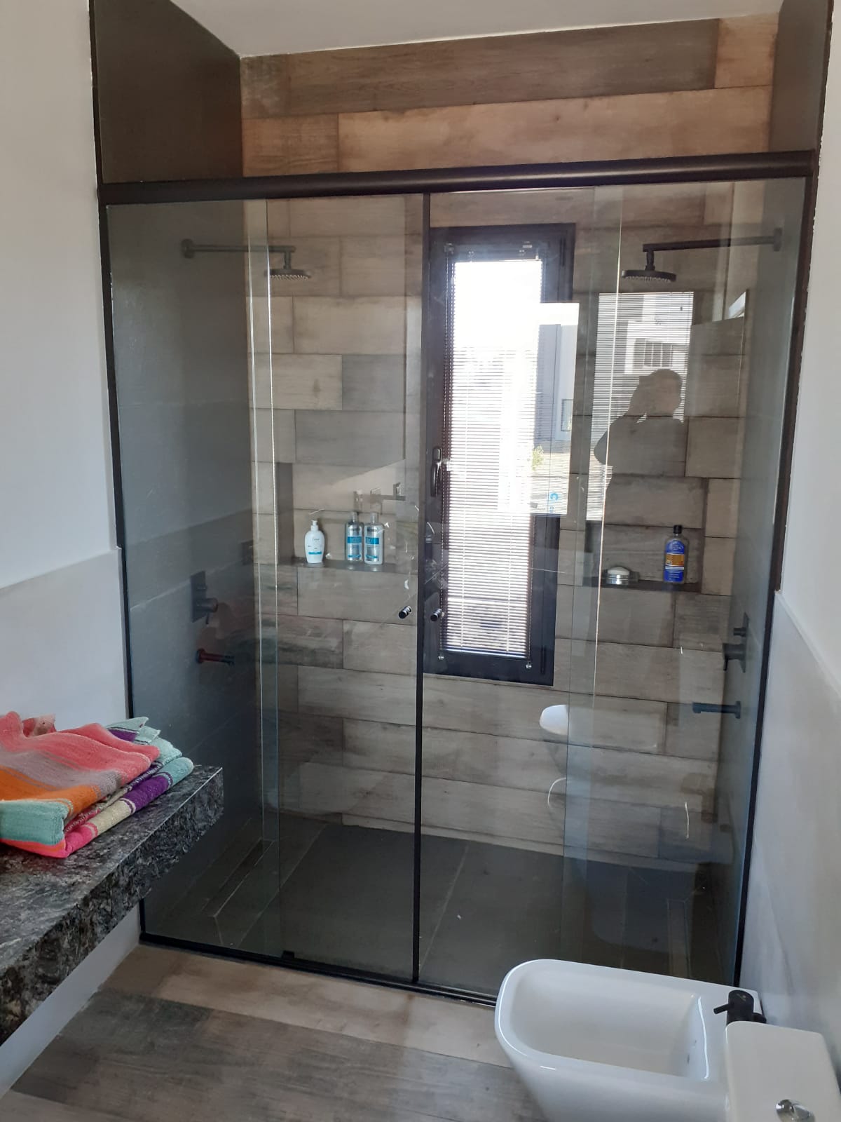División de vidrio con bordes en aluminio negro para baños.