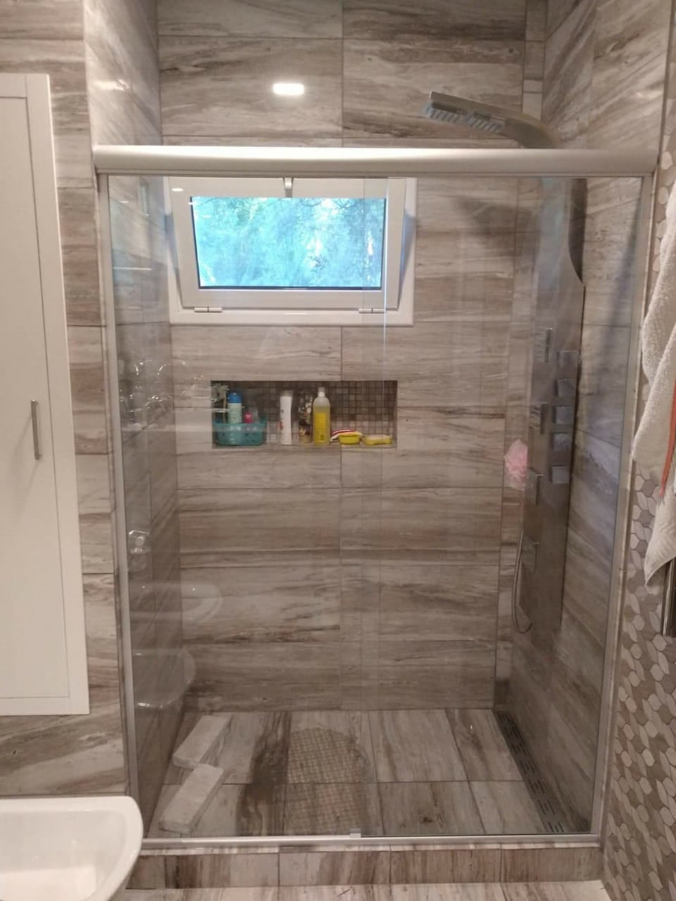 Divisor de baño en vidrio con accesorios de aluminio. Moderno y funcional.