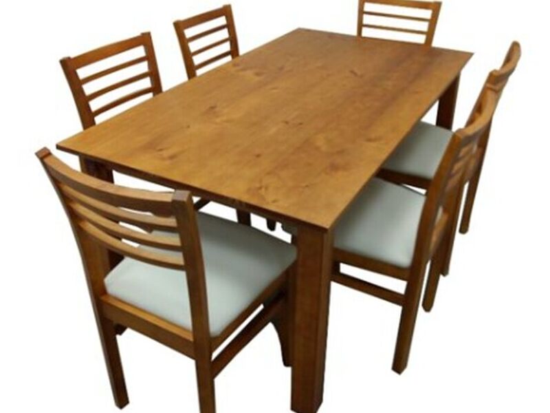 La mesa de 1.60 en color miel acompañada de 6 sillas también en tono miel con tapizado en tela cruda es una combinación clásica y acogedora para el comedor o la cocina. La mesa de 1.60 metros proporciona un amplio espacio para que la familia y los invitados se reúnan cómodamente durante las comidas.