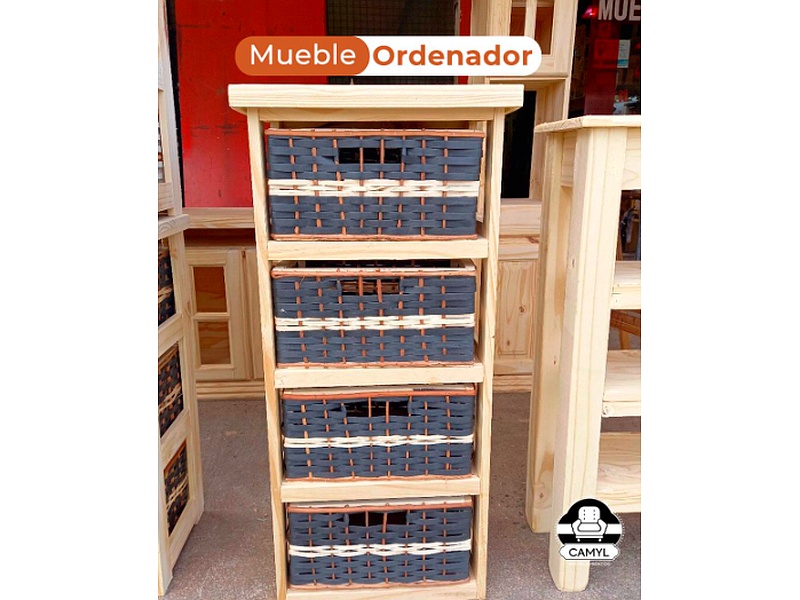 Base de pino con separadores, cajones de mimbre con detalles en color negro o blanco. Este mueble viene con 3, 4 o 6 cajones.