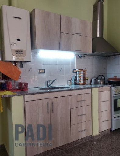 Fabricado en fibromelamina, ofrece durabilidad y fácil limpieza, perfecto para el entorno de la cocina. Su diseño se caracteriza por líneas rectas y acabados que imitan la madera clara, aportando calidez y frescura al espacio. Incluye estantes y cajones que permiten un almacenamiento eficiente de utensilios y alimentos