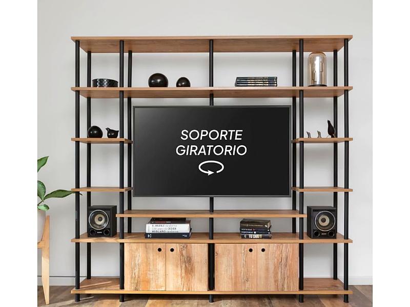 El Rack de TV que combina estilo y funcionalidad! Con 4 cuerpos y siete niveles de apoyo, este mueble cuenta con dos módulos adicionales con puertas, perfectos para mantener todo organizado. Su soporte exclusivo y giratorio se adapta a televisores de hasta 50″ (tener en cuenta al tomar las medidas el marco de la tv), dándole un toque moderno a tu espacio.