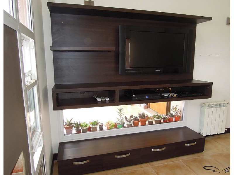 Mueble diseñado para colocar el televisor y otros dispositivos de entretenimiento, con estantes adicionales para almacenamiento.
