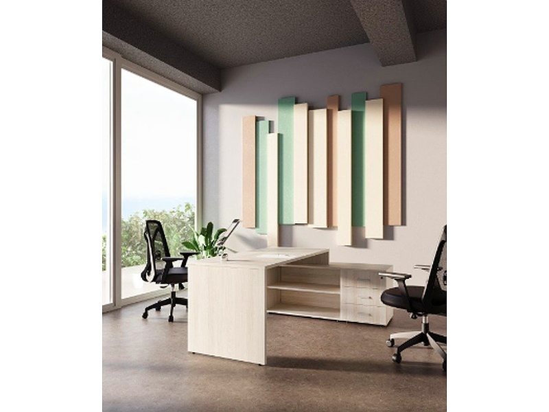 Es una solución funcional que combina un espacio de trabajo amplio con almacenamiento adicional. Su diseño incluye una superficie de trabajo cómoda y cajones o estantes en la credenza, ideal para mantener documentos y materiales organizados.