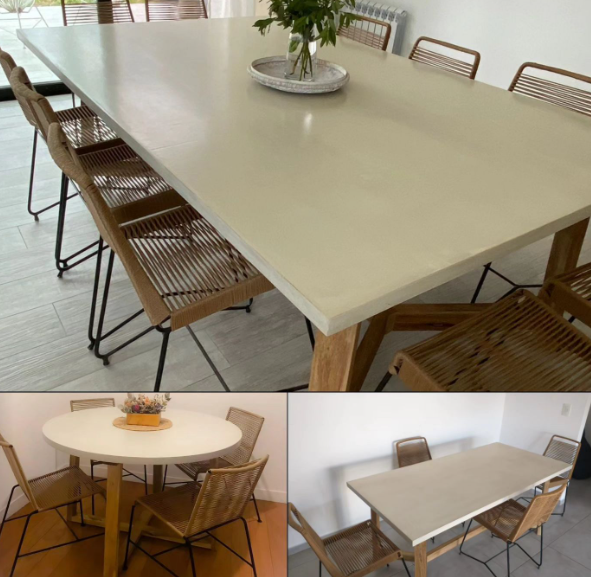 Estas mesas combinan la sofisticación del microcemento, que proporciona una superficie lisa y contemporánea, con la robustez del petiribí macizo, una madera resistente y de alta calidad.