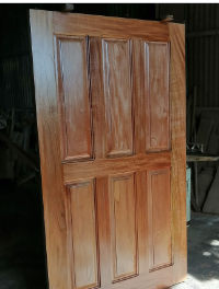 Puerta hecha completamente de madera maciza, ideal para interiores o exteriores. Puede tener acabados lisos, panelados o con detalles tallados, según el estilo deseado.