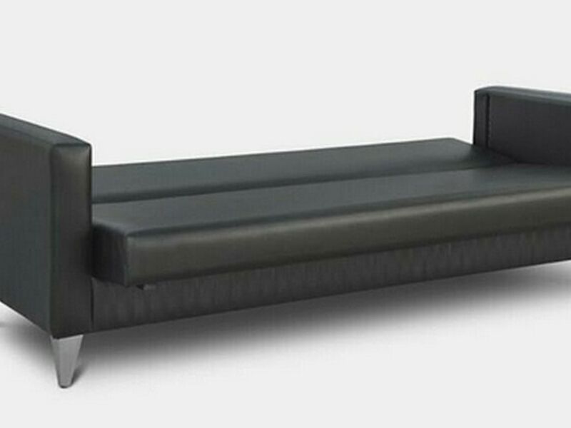 Posee patas de aluminio y un mecanismo para transformarlo en cama. Profundidad cerrado: 75 cm