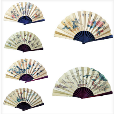 Abanico chino, confeccionado en madera y tela estampada.