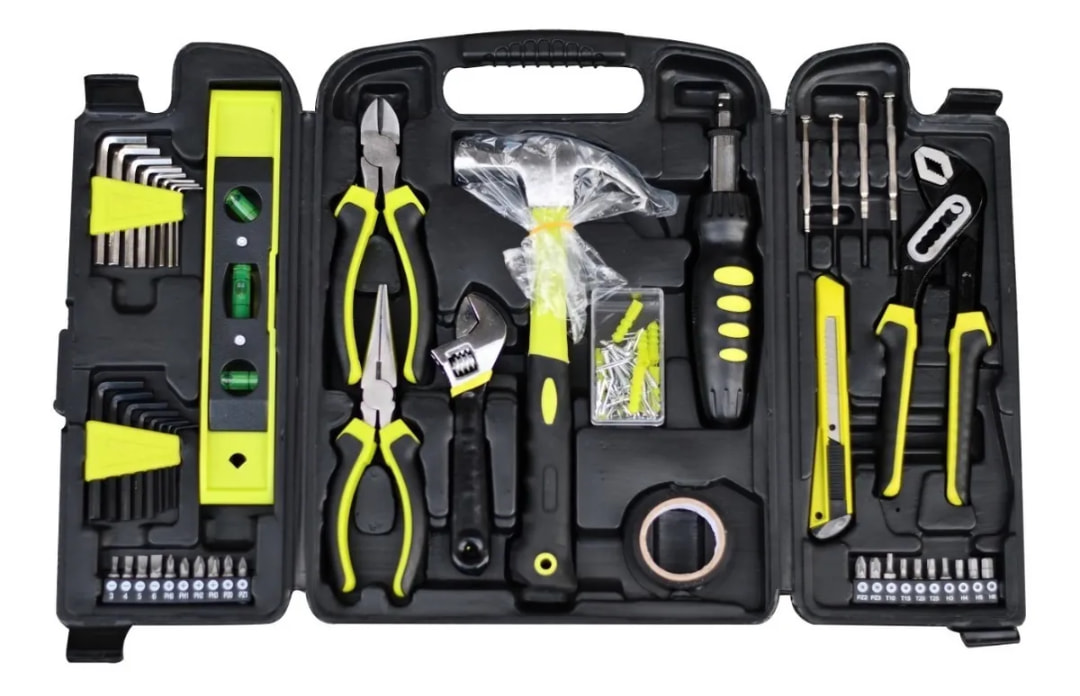 Estos kits suelen incluir una variedad de herramientas, como llaves, destornilladores, alicates, martillos y herramientas de precisión, todas organizadas en un maletín o caja de herramientas.