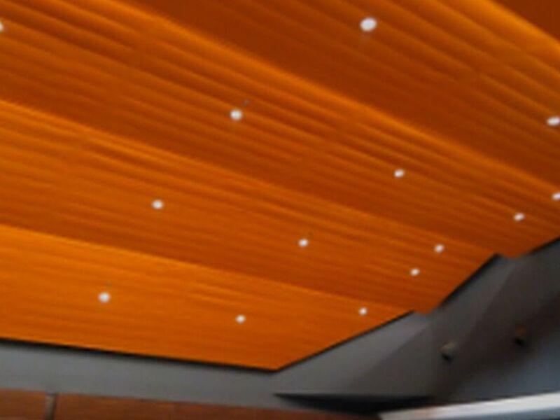 SKIN MEGA se utiliza en grandes superficies por su fácil colocación con un sistema oculto sin fijaciones a la vista y bajo peso. Se pueden combinar diferentes anchos en un mismo uso, ya sea como revestimiento o cielorraso.
