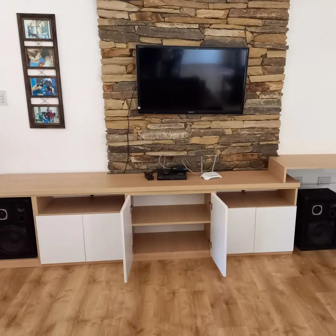 Una mesa de TV de madera es un mueble generalmente más simple y compacto diseñado para sostener la televisión y posiblemente algunos dispositivos multimedia, como reproductores de DVD o consolas de videojuegos. Por lo general, no incluye tanto espacio de almacenamiento como un centro de entretenimiento más grande y se centra en brindar un soporte estable para la televisión, a menudo con uno o dos estantes inferiores para componentes adicionales.