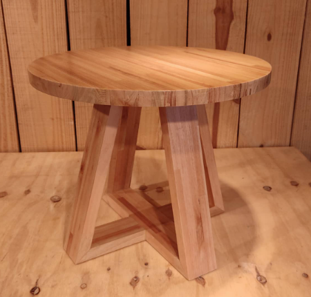 Medidas de 53cm de diámetro x 45cm de altura x 3 cm de espesor, hecho en eucalipto compensado terminado con hidrilaca transparente.