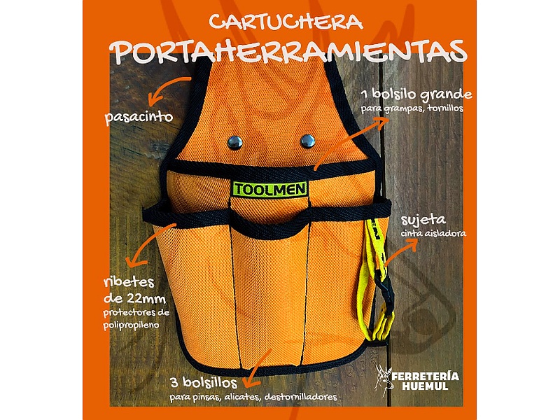 Útil, versátil, liviana y confeccionada con tela resistente. Pasa el cinto por el lugar indicado y ten las herramientas que necesites a mano.