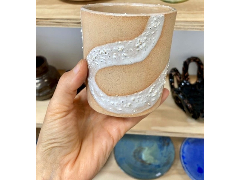 Florero hecho a mano en cerámica de baja temperatura esmaltada por Martina Sylwan 8.5 cms de diámetro 9 cms de alto