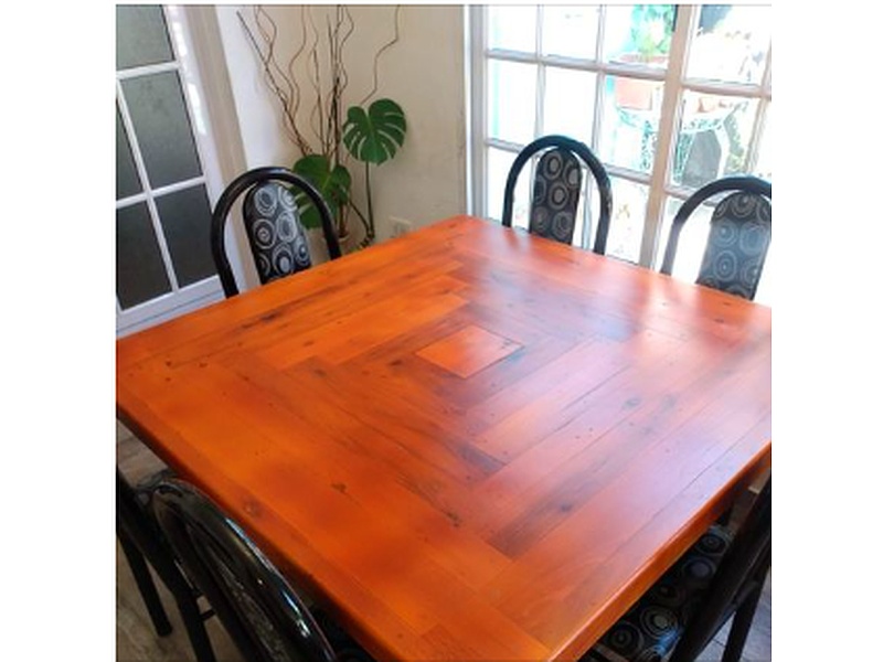 Súper mesa cuadrada en madera de pino y eucalipto. Diseño único de maderas entrelazadas y pie central estilo cúbico con detalles torneados. El tamaño es de 1,45 x 1,45 x 0,75 de altura, con capacidad de hasta 8 sillas. Terminación en doble tono, cedro y chocolate, con pintura Cetol.