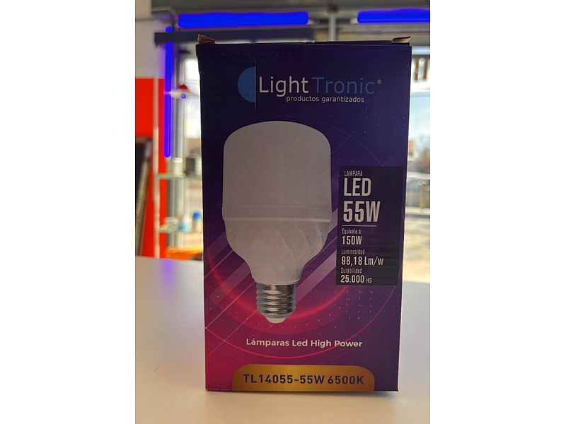Lámpara de alta potencia de 55W, diseñada para iluminar grandes áreas con luz fría. Su tecnología LED garantiza eficiencia energética y durabilidad, ideal para espacios industriales.
