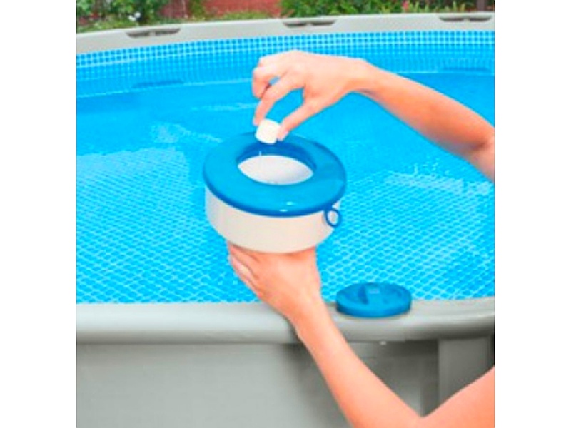 Dispensador químico flotante Intex para piscinas y spas. Diámetro de 17,8 cmCapacidad para una pastilla de cloro de hasta 7,6 cm. Dispone de tapa de doble cierre y anillo de control ajustable. Material: polipropileno resistente y anticorrosivo. Recomendado para todas las piscinas y spa Intex.