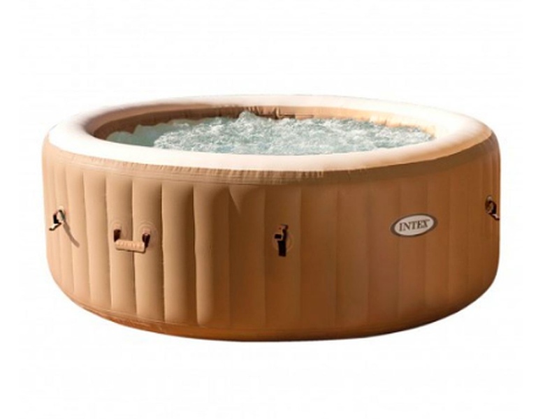 Spa inflable circular INTEX color crema y marrón con masaje de burbujas para relajarte en casa. Modelo PureSpa Bubble Massage. Capacidad para 4 personas y 795 litros de agua. Mide 196 cm de diámetro exterior y 145 cm de diámetro interior. Tiene una altura de 71 cm. Construcción con tecnología Fiber-Tech: estructura interior compuesta por miles de fibras de poliéster para una firmeza y confort superiores que evita su deformación con el uso. Material laminado Super-Tough: 3 capas de PVC-Poliéster para mayor resistencia frente a posibles roces o perforaciones. Lleva integrada depuradora de cartucho tipo S1 con caudal 1.741 litros/hora con sistema de tratamiento antical que convierte el agua dura en agua más suave para la piel y la ropa. Tiene 120 salidas de aire que proporcionan un agradable masaje de burbujas y agua caliente. Dispone de calentador de agua para conseguir una temperatura entre 20º y 40º. Cuenta con 2 asas de agarre para moverlo (vacío). Peso: 44 kg. Espacio mínimo recomendado para colocar el spa: 2,95x2,95 metros