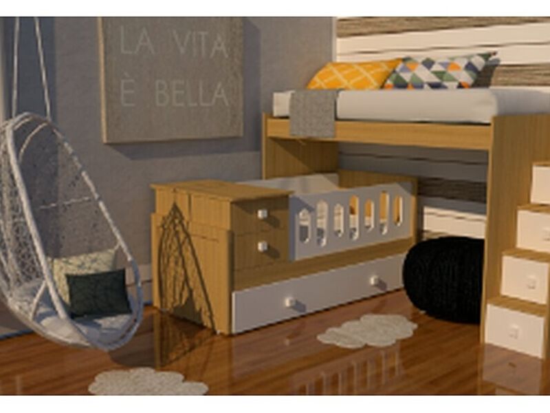 Cama puente, con escalera-cajonera, con el agregado de nuestra cuna funcional con sus características únicas de mercado! La cuna se desmonta y queda como cama normal de una plaza.