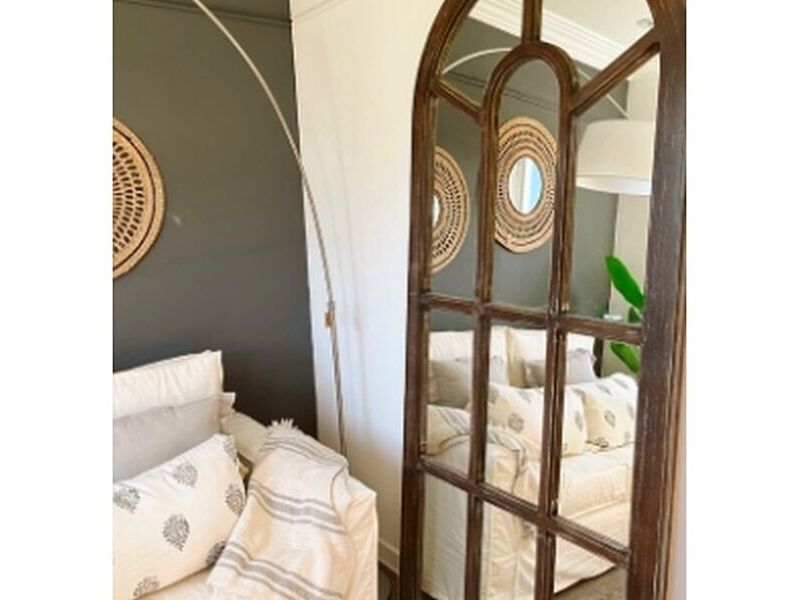 El vidrio está dividido en secciones, creando un efecto visual interesante y añadiendo un toque de sofisticación y estilo rústico a cualquier ambiente. Este espejo no solo amplía visualmente los espacios, sino que también aporta calidez y carácter, siendo ideal para entradas, salones o dormitorios.