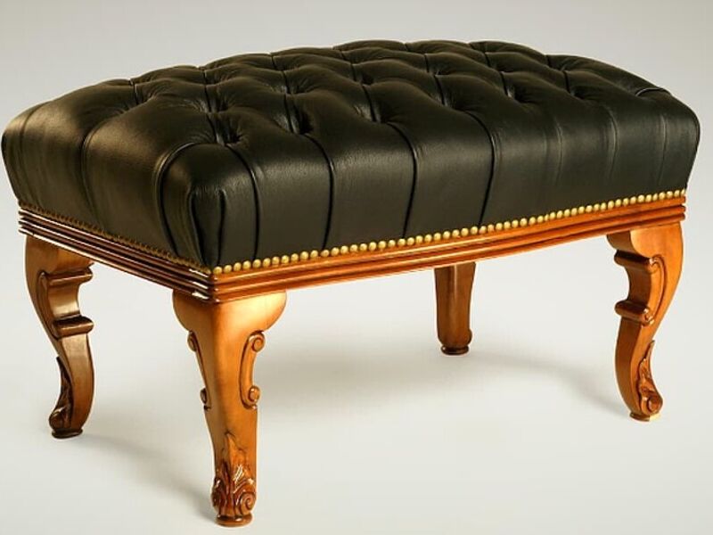 "Banqueta de estilo antiguo con estructura de madera y acolchado negro: Esta banqueta combina el encanto del estilo antiguo con la comodidad del acolchado negro, agregando un toque de elegancia y distinción a cualquier espacio."