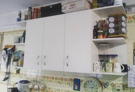 Alacena con tres puertas y estantes medios. Laterales abiertos para objetos cotidianos (tazas, café y condimentos). Todo melamina blanca de 18mm. De fácil higiene