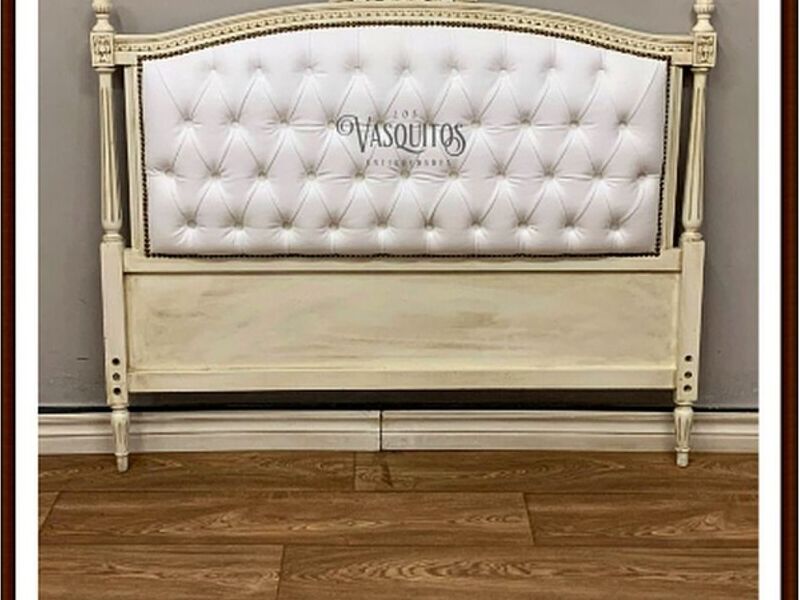 PRODUCTO: ****Respaldo Luis XVI *** “DISPONIBLE” MEDIDAS: Alto 1.30 – Ancho 1.50 TERMINACIÓN: Blanco Patinado. Tapizado Ecocuero Blanco. Tachas Plateadas.
