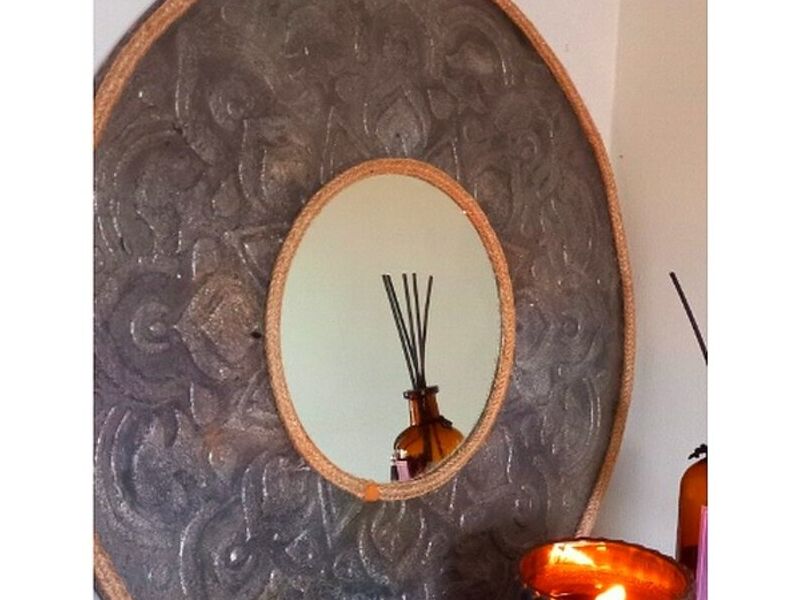 Espejo con relieve y terminaciones de fibras naturales. Marco 50cm de diam.