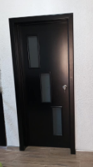 Puerta con un diseño moderno y contemporáneo. Puede tener líneas limpias, superficie lisa y posiblemente detalles de cristal.