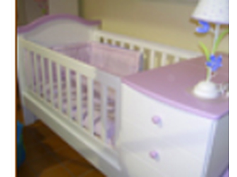 Cuna funcional en diversos colores. Laca poliuretano. Set de acolchados y chichonera. Velador.