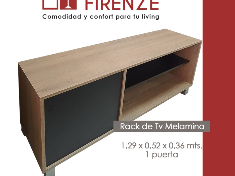 ¡Renová tu sala con nuestro Rack de TV en melamina! Con medidas de 1,29 x 0,50 x 0,36 y una puerta, este mueble es la combinación perfecta de estilo y practicidad para tu entretenimiento.