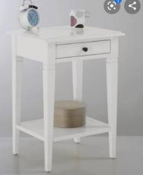 Mesita de noche o velador con diseño sencillo, posiblemente de color blanco. Puede tener un cajón o estante para almacenamiento.