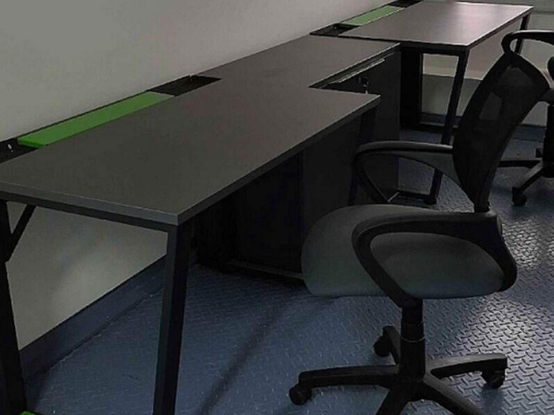 Escritorio simple con diseño geométrico y colores modernos con estructura metálica para home office, oficinas, etc.