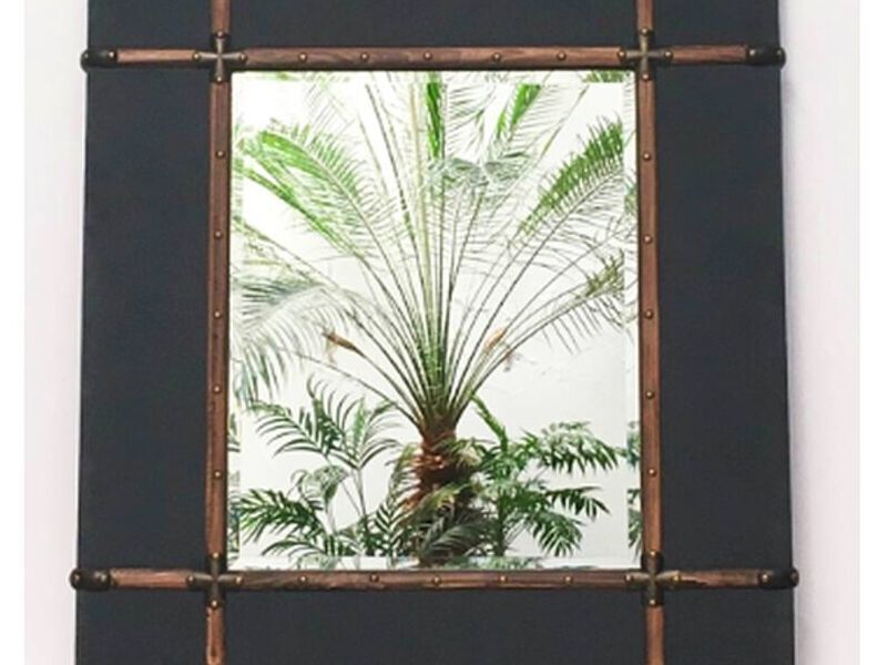 Espejo revestido en tela gris con apliques simil cuero y madera –