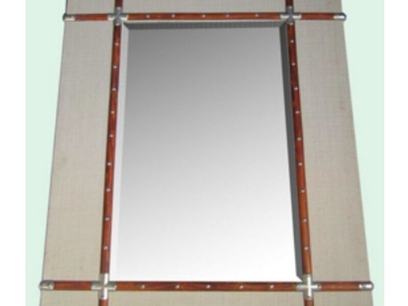 Espejo revestido en tela color nude con apliques simil cuero y madera
