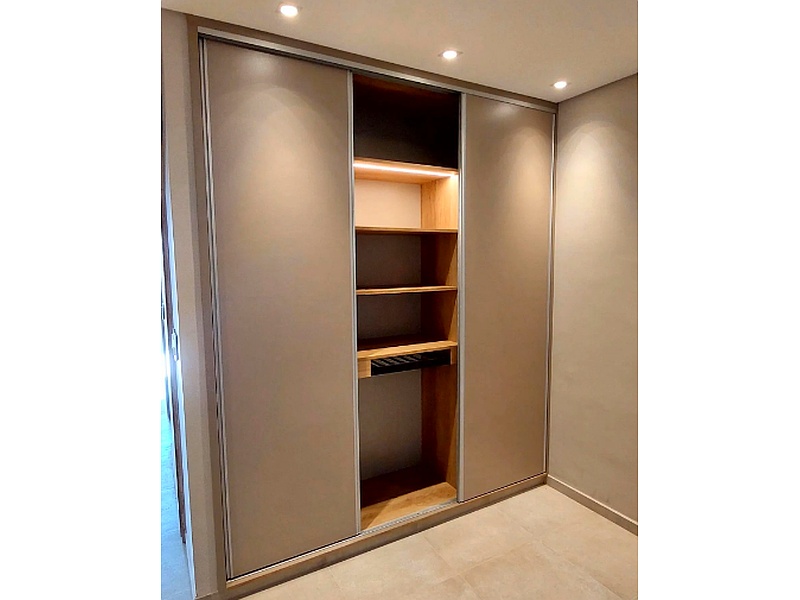 Placar con sistema de puertas corredizas y cajones con cierre suave e iluminación interna en colores cálidos .