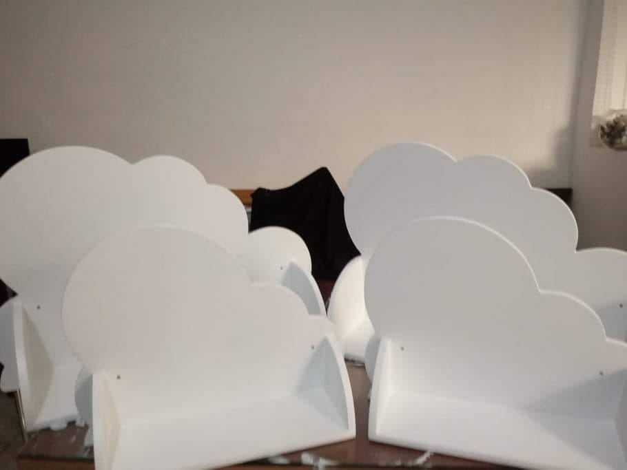 Medidas estándar de 40 cm y de 60 cm, ese es el ancho y alto de las nubes, es MDF de 12 mm los estantes y de 9 mm las nubes, esta todo con tarugos y cola vinílico