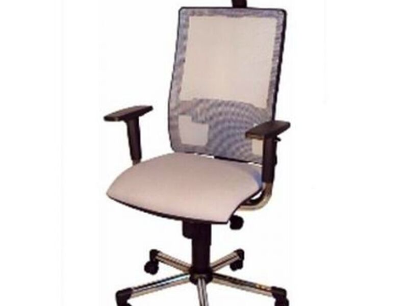 Estructura plastica, Respado tapizado en tela mesh. Asiento tapizado en eco cuero beige. Apoye lumbar.