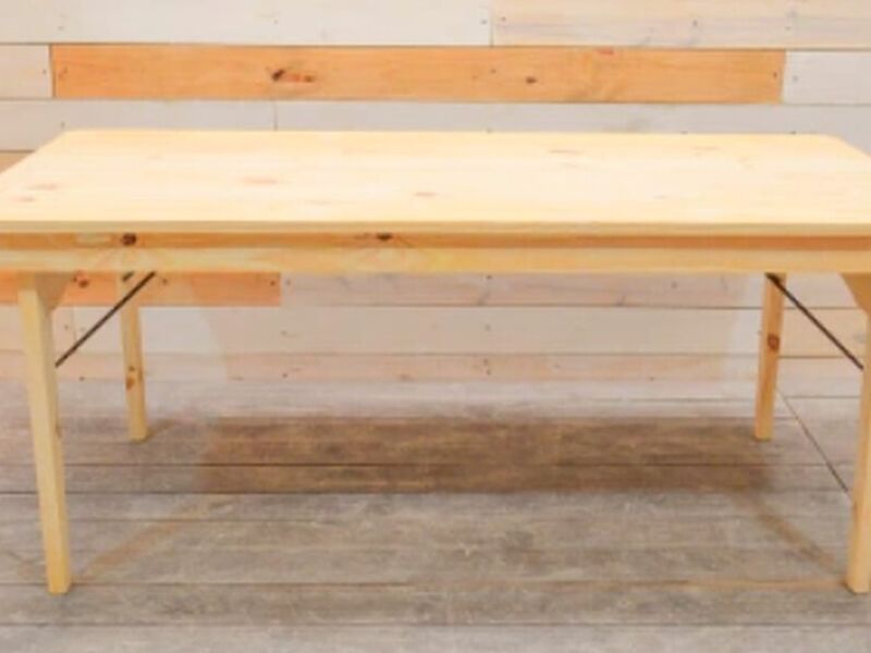 Mesa en pino de patas rebatibles con liston de seguridad para su fácil transpotación, tapa de tablas de 2 x 15 cm maciza con refuerzos.