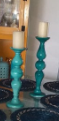 Soportes decorativos para velas de color celeste, utilizados para crear ambientes cálidos y acogedores en interiores. Las medidas dependen del diseño específico del portavelas.