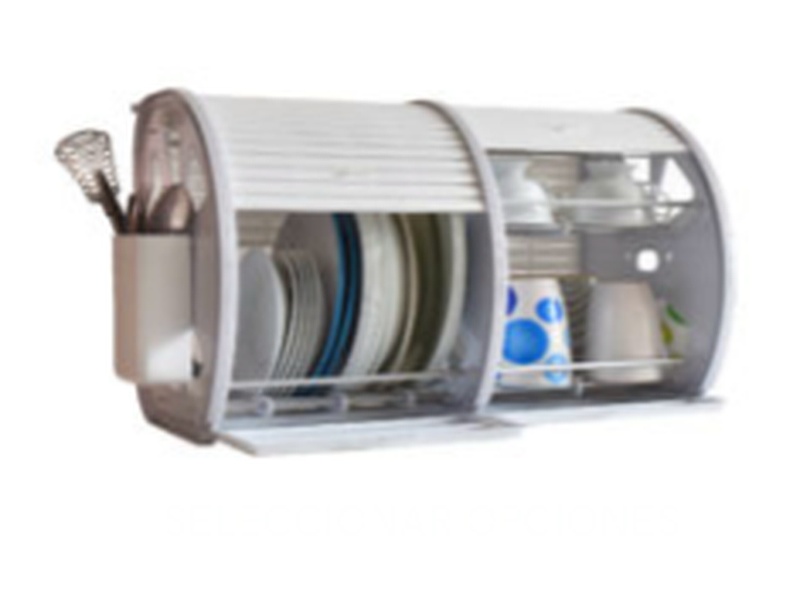 Alacena Escurridora Secamax, tiene persianas que cubren su vajilla del polvo, porta cubiertos, y bandeja para retener el exceso de agua.