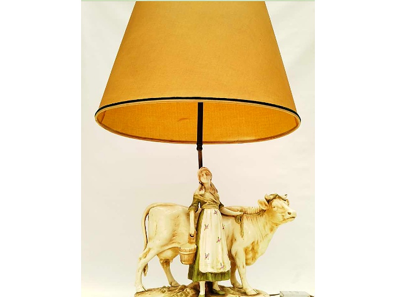 Importante Lámpara de mesa con cuerpo de figura de “Campesina con vaca y balde de ordeño” atribuida a Royal Dux, con lira regulable de 2 luces y pantalla. (con pequeño chip en la base). Mide: 76 cm de alto total, 31 cm de alto cuerpo, 33 cm de frente y 17 cm de profundidad.