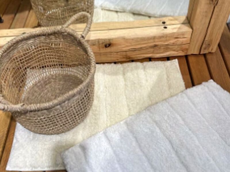 Alfombra rectangular de acrilico con costura en su ancho. Colores crudo, gris y blanco.