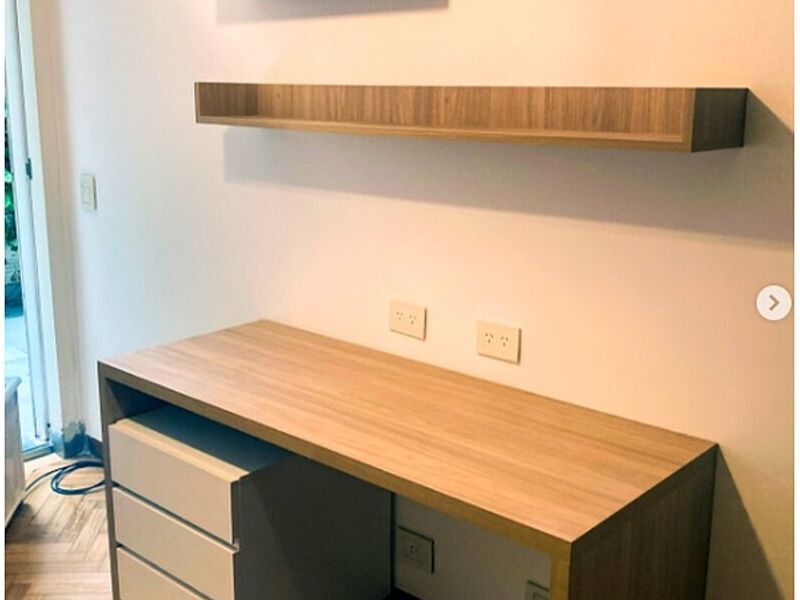 Escritorio con amplia cajonera y repisas en melamina